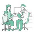 診察室で、女の子(幼児~小学生)を連れたお母さんから症状や悩みを聞き取っている、白衣(ドクターコート)を着用した男性医師のイラストです。 小児科での「定期健診」や「風邪の診察」はもちろん、子供に多い「アトピー性皮膚炎」や「あせも」などの皮膚科相談、あるいは「中耳炎」や「花粉症」などの耳鼻咽喉科の受診シーンに最適です。 落ち着いて座っている女の子と、医師に相談する母親が描かれており、入学前の「就学時健康診断」や、地域のかかりつけ医による丁寧な診察風景として幅広くご利用いただけます。