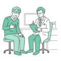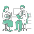診察室で、赤ちゃん(乳児)を連れたお母さんから普段の様子や悩みを聞き取っている、白衣(ドクターコート)を着用した男性医師のイラストです。 小児科専門医による「乳幼児定期健診(1ヶ月検診・3ヶ月検診など)」や「予防接種(ワクチン)」のスケジュール相談、あるいは湿疹やアトピーなどの「皮膚トラブル」の受診シーンに最適です。 穏やかな雰囲気で描かれており、初めての育児に不安を感じる保護者に寄り添う「地域のかかりつけ小児科医」のイメージ画像として幅広くご利用いただけます。