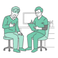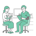 診察室で、赤ちゃん(乳児)を連れたお母さんから発育状況や悩みを聞き取っている、スクラブ(手術着・医療用ユニフォーム)を着用した男性医師のイラストです。 「乳幼児健診(1ヶ月・6ヶ月検診など)」や「予防接種」のスケジュール相談、あるいは「アトピー性皮膚炎」などのスキンケア指導シーンに最適です。 威圧感の少ないカラフルなスクラブ姿の医師は、小児科クリニックの「優しさ」や「親しみやすさ」を表現するのに適しており、育児サイトや病院ホームページのメインビジュアルとしても幅広くご利用いただけます。