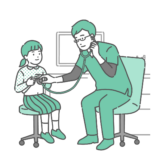 診察室で、赤ちゃん(乳児)を連れたお母さんから発育状況や悩みを聞き取っている、スクラブ(手術着・医療用ユニフォーム)を着用した男性医師のイラストです。 「乳幼児健診(1ヶ月・6ヶ月検診など)」や「予防接種」のスケジュール相談、あるいは「アトピー性皮膚炎」などのスキンケア指導シーンに最適です。 威圧感の少ないカラフルなスクラブ姿の医師は、小児科クリニックの「優しさ」や「親しみやすさ」を表現するのに適しており、育児サイトや病院ホームページのメインビジュアルとしても幅広くご利用いただけます。