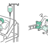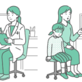 診察室で男の子(幼児~小学生)を連れた母親を診察する、女性医師(小児科医)のイラスト2点セットです。 男の子が落ち着いている「定期検診・アレルギー相談シーン」と、顔色が悪くぐったりしている「発熱・感染症相談シーン」を並べています。 「学校検診や予防接種」と「風邪・インフルエンザでの受診」の使い分けや、登園・登校の目安(出席停止期間の解説)、あるいは「病院に行くべきか迷った時の判断基準」を示す記事の図解として最適な比較素材です。