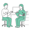 診察室で男性患者を診察する女性医師のイラスト2点セットです。 穏やかに症状や経過を話している「通常の問診シーン」と、冷や汗をかいて胸の痛みを訴えている「緊急・体調不良シーン」を並べています。 治療による「回復のビフォーアフター」の表現や、定期検診と緊急受診の使い分け(「こんな時はすぐ病院へ」)などの解説図解として使いやすい素材です。