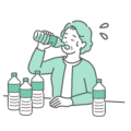 介護・福祉糖尿病の典型的な自覚症状である「口渇(こうかつ)」と「多飲」を描いたイラストです。高齢男性が喉の渇きに耐えきれず、ペットボトルの水を大量に摂取している様子を表現しています。 加齢により喉の渇きを感じにくくなる「隠れ脱水」への注意喚起や、高血糖による口渇、夏場の熱中症予防、介護現場での水分補給のイメージ素材として幅広くご利用いただけます。
