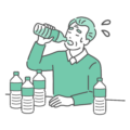生活習慣夜間頻尿(夜中に何度もトイレに起きる症状)を描いたイラストです。糖尿病の高血糖による多尿や、男性特有の前立腺肥大症、過活動膀胱などが原因で、睡眠が妨げられている様子を表現しています。 時計は深夜を指しており、眠い目をこすりながら起き上がる辛さや、中途覚醒によるQOL(生活の質)の低下、睡眠障害のイメージ素材として最適です。