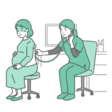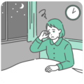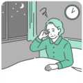 夜間頻尿(夜中に何度もトイレに起きる症状)に悩む高齢女性のイラストです。 加齢による膀胱機能の低下や過活動膀胱、糖尿病、腎臓の働き、あるいは体の冷えなどが原因で、安眠を妨げられているシーンを表現しています。深夜のトイレ移動は転倒リスクもあるため、在宅介護や医療の注意喚起、シニアの健康管理素材としても最適です。