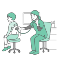 診察室でスクラブを着用した女性医療従事者(医師、看護師)が、体調不良で泣いている赤ちゃん(乳児)の背部(背中)に聴診器を当てて診察しているイラストの「異常あり・体調不良」バージョンです。赤ちゃんは大泣きし、お母さんも不安そうな表情を浮かべています。RSウイルスによる細気管支炎、喘息性気管支炎、肺炎など、呼吸器系のトラブルで機嫌が悪い状態や、夜間救急外来での緊迫した診察シーンを描く素材として最適です。「こんな時は病院へ」という注意喚起のアイキャッチに非常に効果的です。