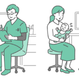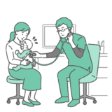 診察室で白衣(ドクターコート)を着た女性医師が女の子(児童・小学生)の胸部を聴診しているイラストの「通常時」と「体調不良時」を並べたバリエーションセットです。左側は就学時健診や学校での内科検診などの落ち着いたシーン、右側は小児喘息の発作、肺炎、インフルエンザの高熱、心雑音などの自覚症状がある場合や、急変時の緊迫したシーンを描いています。健診と病気の比較、症状の有無によるビフォーアフター、学校保健の教材などに便利な一枚です。