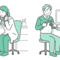 診察室で白衣(ドクターコート)を着た女性医師が乳児(赤ちゃん)の胸部を聴診しているイラストの「通常時(笑顔)」と「異常時(泣き顔)」を並べたバリエーションセットです。左側は定期健診や予防接種の予診などの落ち着いたシーン、右側は発熱・感染症による不機嫌、人見知り、注射での恐怖、または体調不良を訴えている緊迫したシーンを描いています。健診と病気の比較、予防接種のビフォーアフター、子供の受診ガイドなどに便利な一枚です。