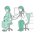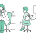 診察室で白衣を着た女性医師(小児科医)が、赤ちゃん(乳児)の背部(背中)に聴診器を当てて診察しているイラストの「通常時」と「体調不良時」を並べたバリエーションセットです。左側は定期的な乳幼児健診や予防接種前のチェック、右側はRSウイルス感染症による細気管支炎、ヒトメタニューロウイルス、肺炎などで「ゼーゼー」という呼吸音が疑われる緊迫したシーンを描いています。「普段の様子」と「病気のサイン(不機嫌・呼吸苦)」を対比させて解説する小児医療・育児資料に最適な一枚です。
