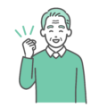 高齢男性緑色のセーターに襟付きシャツを着た高齢男性(シニア)が、目を細めた笑顔で右手の指でOKサインを作っている上半身イラストです。介護施設やデイサービスの案内パンフレットでの「正しいケア方法」「おすすめの選択肢」の紹介、シニア向けの健康コラムでの「正解」「承認」「安心」を伝えるシーンなどに最適です。読者やご家族に肯定的なメッセージと親しみやすさを与える、清潔感のあるシンプルな線画デザインです。