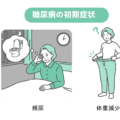 高齢男性(おじいさん)の糖尿病初期症状を4つのシーンで解説したイラストセットです。 1. 多飲・口渇:喉が渇いてペットボトルの水を大量に飲む 2. 多尿・頻尿:夜中にトイレに起きる(前立腺肥大症との識別に注意) 3. 体重減少:食べているのに急に痩せてズボンが緩くなる(悪性腫瘍やフレイルとの識別に注意) 4. 全身倦怠感:体がだるく、ため息をつく(男性更年期障害やうつとの混同に注意) 高齢者の健康管理、デイサービス利用者のご家族向け配布資料、地域包括支援センターの啓発ポスターなどに最適な、分かりやすい図解素材です。