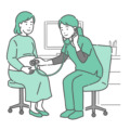 診察室でスクラブ(医療用ユニフォーム)を着た女性医療従事者が、女の子(児童・小学生)の胸部を聴診しているイラストの「体調不良」バージョンです。女の子は脂汗(冷や汗)をかき、顔色が悪く苦しそうな表情を浮かべています。医療従事者も真剣で深刻な顔つきをしており、小児喘息の発作、インフルエンザの高熱、肺炎、心雑音の疑い、または学校の保健室や救急外来(ER)での緊迫した処置シーンに最適です。