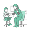 小児科・子供の健康診察室でスクラブ(医療用ユニフォーム)を着た女性医療従事者が、男の子(児童・小学生)の胸部を聴診しているイラストの「体調不良」バージョンです。男の子は脂汗(冷や汗)をかき、顔色が悪く苦しそうな表情を浮かべています。医療従事者も真剣で深刻な顔つきをしており、小児喘息の発作、インフルエンザの高熱、肺炎、心雑音の疑い、または学校の保健室や救急外来(ER)での緊迫した処置シーンに最適です。
