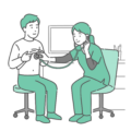 診察室でスクラブ(医療用ユニフォーム)を着た女性医療従事者が、男性患者の胸部を聴診しているイラストの「体調不良」バージョンです。男性は脂汗(冷や汗)をかき、顔色が悪く苦しそうな表情を浮かべています。女性も真剣で深刻な顔つきをしており、救急外来(ER)での診察、心筋梗塞や狭心症の疑い、肺炎による呼吸困難、または病棟や介護施設での急変時(バイタルサイン確認)などの緊迫した医療シーンに最適です。