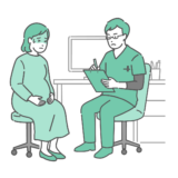 診察室で白衣(ドクターコート)を着た女性医師が高齢の女性患者(シニア)の胸部を聴診しているイラストの「体調不良」バージョンです。女性は脂汗(冷や汗)をかき、顔色が悪く不安な表情を浮かべています。医師も真剣で深刻な顔つきをしており、うっ血性心不全、誤嚥性肺炎、不整脈(心房細動)、狭心症などの病気が疑われるシーンや、訪問診療(在宅医療)や介護施設での利用者の急変、緊急搬送の判断が迫られるような緊迫した診察シーンに最適です。