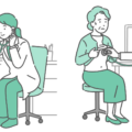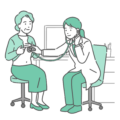 介護・福祉診察室で白衣(ドクターコート)を着た女性医師が高齢の女性患者(シニア)の胸部を聴診しているイラストの「体調不良」バージョンです。女性は脂汗(冷や汗)をかき、顔色が悪く不安な表情を浮かべています。医師も真剣で深刻な顔つきをしており、うっ血性心不全、誤嚥性肺炎、不整脈(心房細動)、狭心症などの病気が疑われるシーンや、訪問診療(在宅医療)や介護施設での利用者の急変、緊急搬送の判断が迫られるような緊迫した診察シーンに最適です。
