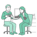 診察室でスクラブ(医療用ユニフォーム)を着た女性医療従事者が、高齢の男性患者(シニア)の胸部を聴診しているイラストの「体調不良」バージョンです。男性は脂汗(冷や汗)をかき、顔色が悪く苦しそうな表情を浮かべています。医療従事者も真剣で深刻な顔つきをしており、心不全の悪化、誤嚥性肺炎、COPD(慢性閉塞性肺疾患)の呼吸苦、または介護施設や訪問看護先での急変時(バイタルサイン異常発見・ドクターコール)などの緊迫した医療・介護シーンに最適です。