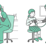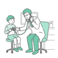 白衣を着用した男性医師が、体調不良を訴える男の子(幼児〜小学生)に対して「聴診」を行っている小児科診察のイラストです。 男の子は冷や汗をかいており、医師は真剣な表情で心音や呼吸音の異常(喘鳴・ラ音・心雑音など)を確認しています。 子供の「気管支喘息」の発作時や、インフルエンザ・肺炎による高熱、あるいはマイコプラズマ肺炎などの呼吸器疾患の診断シーンとして、小児救急や感染症流行期の医療情報サイト、保護者向け資料などに最適です。