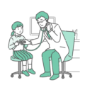 小児科・子供の健康白衣を着用した男性医師が、体調不良を訴える男の子(幼児〜小学生)に対して「聴診」を行っている小児科診察のイラストです。 男の子は冷や汗をかいており、医師は真剣な表情で心音や呼吸音の異常(喘鳴・ラ音・心雑音など)を確認しています。 子供の「気管支喘息」の発作時や、インフルエンザ・肺炎による高熱、あるいはマイコプラズマ肺炎などの呼吸器疾患の診断シーンとして、小児救急や感染症流行期の医療情報サイト、保護者向け資料などに最適です。