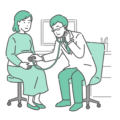 白衣を着用した男性医師が、体調不良を訴える妊婦(マタニティ)に対して「聴診」を行っている産婦人科診察のイラストです。 患者は冷や汗をかき不安な表情をしており、医師は真剣な眼差しで母体やお腹の赤ちゃんの異常(切迫早産・胎児機能不全・子宮収縮など)を確認しています。 「お腹の張り」や「激しい腹痛」、妊娠高血圧症候群、あるいはつわりの重症化(妊娠悪阻)など、妊娠期のリスクや緊急受診が必要な症状を解説する医療記事や、注意喚起のパンフレットに最適です。