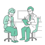 白衣を着用した男性医師が、成人女性の患者に対して「聴診」を行っているイラストです。 患者が服を少しめくり、医師が聴診器(ステート)を胸に当てて心音や呼吸音をチェックしている、一般的な内科診察のシーンを描いています。 風邪やインフルエンザの診察、会社の定期健康診断、あるいは動悸・息切れの相談(循環器内科)など、女性の患者さんが受診するあらゆる内科的シーンの挿絵として最適です。
