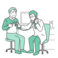 白衣を着用した男性医師が、乳幼児(赤ちゃん)に対して「聴診」を行っている小児科診察のイラストです。 母親に抱っこされた安心できる状態で、医師が優しく聴診器(ステート)を当て、心音、呼吸音、腸の動きなどを確認しているシーンを描いています。 3ヶ月健診などの定期健診や、風邪・発熱時の受診、あるいは予防接種を受ける前の体調チェック(予診)など、小児医療や育児支援に関連するWebサイト、パンフレット、母子手帳の副読本などに最適です。