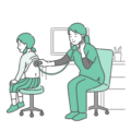 診察室でスクラブを着用した女性医療従事者(医師、看護師)が、体調不良の女の子(児童)の背部(背中)に聴診器を当てて診察しているイラストの「異常あり・体調不良」バージョンです。女の子は脂汗(冷や汗)をかき、呼吸が苦しそうな様子です。医療従事者も真剣で深刻な顔つきをしており、小児喘息の大発作、マイコプラズマ肺炎や気管支炎の重症化、あるいは高熱による消耗など、保護者に対して「すぐに病院へ」「救急車を呼ぶ目安」といった緊急性の高い情報を伝える素材として最適です。