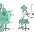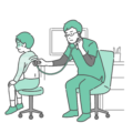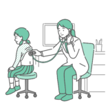 診察室でスクラブ(医療用ユニフォーム)を着用した男性医師が、体調不良の女の子(小学生)の背部(背中)に聴診器を当てて診察をしているイラストの「異常あり・体調不良」バージョンです。女の子は脂汗(冷や汗)をかき、呼吸が苦しそうな様子です。医師も真剣で深刻な顔つきをしており、気管支喘息の発作、マイコプラズマ肺炎、インフルエンザの重症化など、子供の緊急性が高い病態を描く素材として最適です。小児救急の受診目安や、学校での体調不良時の対応マニュアルなどで重宝されます。