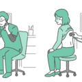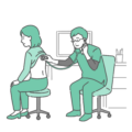 診察室でスクラブ(医療用ユニフォーム)を着用した男性医師が、体調不良の女性患者の背部(背中)に聴診器を当てて診察をしているイラストの「異常あり・体調不良」バージョンです。女性は脂汗(冷や汗)をかき、呼吸が苦しそうな様子です。医師も真剣で深刻な顔つきをしており、急性肺炎、気管支喘息の大発作、過換気症候群(過呼吸)、あるいは肺塞栓症など、緊急性が高いシーンを描く素材として最適です。救急医療の現場や、症状の重症化を警告する医療コラムなどで重宝されます。