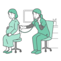 診察室でスクラブを着用した女性医療従事者(産婦人科医、助産師、看護師)が、体調不良の妊婦の背部(背中)に聴診器を当てて診察しているイラストの「異常あり・体調不良」バージョンです。妊婦は脂汗(冷や汗)をかき、呼吸が苦しそうな様子です。医療従事者も真剣で深刻な顔つきをしており、妊娠合併症としての肺炎、周産期心筋症(心不全)による肺水腫、気管支喘息の発作、あるいは母体搬送が必要な緊急事態など、ハイリスクな周産期医療の現場を描く素材として最適です。
