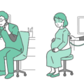 診察室でスクラブ(医療用ユニフォーム)を着用した男性医師が、体調不良の妊婦(妊娠中の女性)の背部(背中)に聴診器を当てて診察をしているイラストの「異常あり・体調不良」バージョンです。妊婦は脂汗(冷や汗)をかき、呼吸が苦しそうな様子です。医師も真剣で深刻な顔つきをしており、妊娠性喘息の悪化、重症肺炎、周産期心筋症、あるいは肺塞栓症(エコノミークラス症候群)の疑いなど、母子ともに危険が迫る緊急性の高いシーンを描く素材として最適です。妊婦さんへの注意喚起や、医療従事者向けの周産期救急マニュアルなどで重宝されます。
