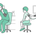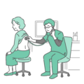 診察室でスクラブ(医療用ユニフォーム)を着用した男性医師が、体調不良の高齢女性(おばあさん)の背部(背中)に聴診器を当てて診察をしているイラストの「異常あり・体調不良」バージョンです。女性は脂汗(冷や汗)をかき、呼吸が苦しそうな様子です。医師も真剣で深刻な顔つきをしており、誤嚥性肺炎の発症、COPD(慢性閉塞性肺疾患)の急性増悪、うっ血性心不全による呼吸困難など、高齢者に多い緊急性の高い病態を描く素材として最適です。介護スタッフ向けの「急変時の対応マニュアル」や、救急医療に関する資料で重宝されます。