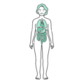 上半身・体幹シニア女性(高齢者)の全身(正面)を描いた人体図モデルの3点セットイラストです。プレーンな体表シルエット、肺や心臓・胃腸などの主要な内臓、頭蓋骨や骨盤などの全身骨格の3パターンが揃っており、介護施設やクリニックのWebサイト、医療・健康系ブログでの図解ベース素材として非常に便利です。加齢に伴う内臓疾患や、骨粗鬆症・変形性膝関節症といった整形外科領域の症状解説など、記事の用途に合わせて幅広く使い分けができます。
