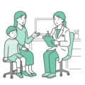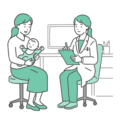 診察室で、泣き止まない赤ちゃん(乳児)を抱っこした母親が、女性医師(小児科医)に症状や悩みを相談しているイラストです。 赤ちゃんは大声で泣いており、母親は困惑や疲労にじんだ表情で、育児の大変さや緊急性を感じさせるシーンです。 赤ちゃんの急な発熱や夜泣き、ぐずり(疳の虫)、便秘といった体調不良での受診イメージに最適です。 また、「泣き止まない」「どうしていいか分からない」といった育児ノイローゼや産後うつ、ワンオペ育児の悩み相談といった、母親のメンタルケアに関するテーマでもご利用いただけます。