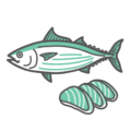 アイテム・アイコンシンプルな線画で描かれた、鰹(カツオ)の刺身(またはタタキ)のイラストです。厚切りの切り身を3切れ並べており、新鮮で美味しそうな様子を表現しています。貧血予防に重要な鉄分やビタミンB12、良質なタンパク質を豊富に含むため、栄養指導の資料に最適です。また、スーパーの鮮魚POP、居酒屋のおすすめメニュー、高知料理や和食の紹介など、グルメ素材としても幅広く活用いただけます。