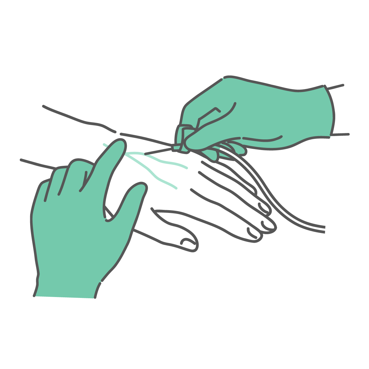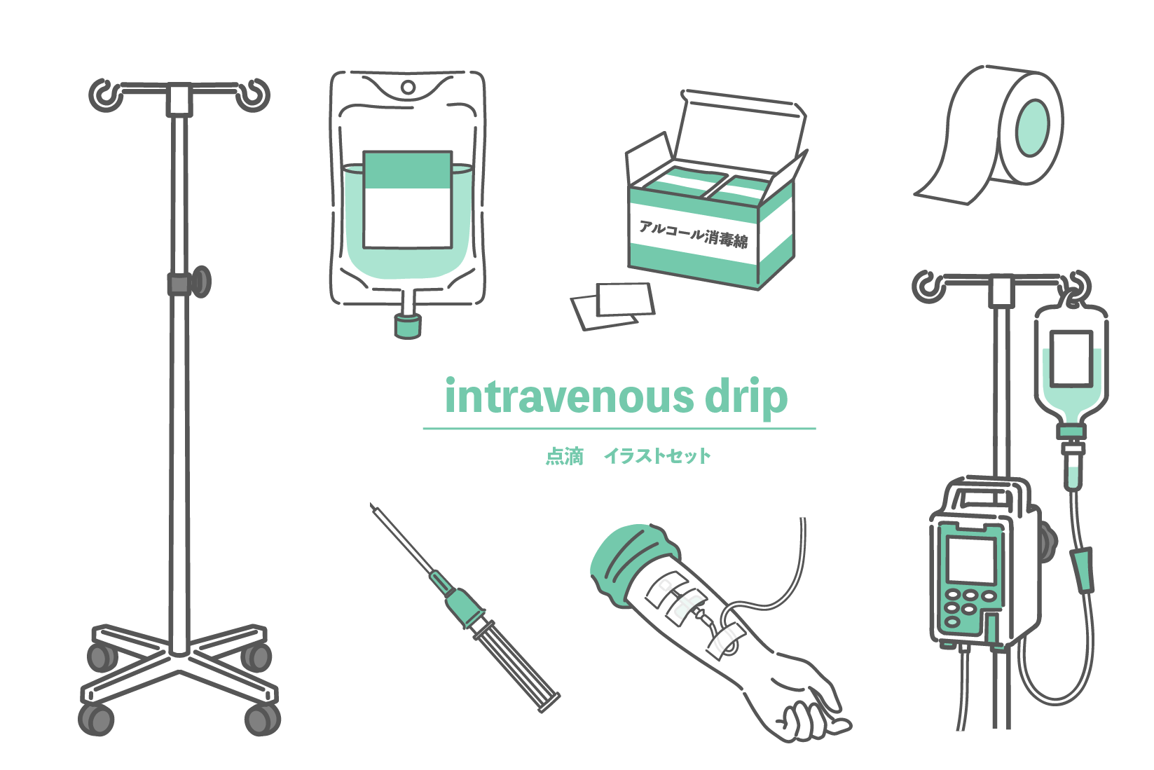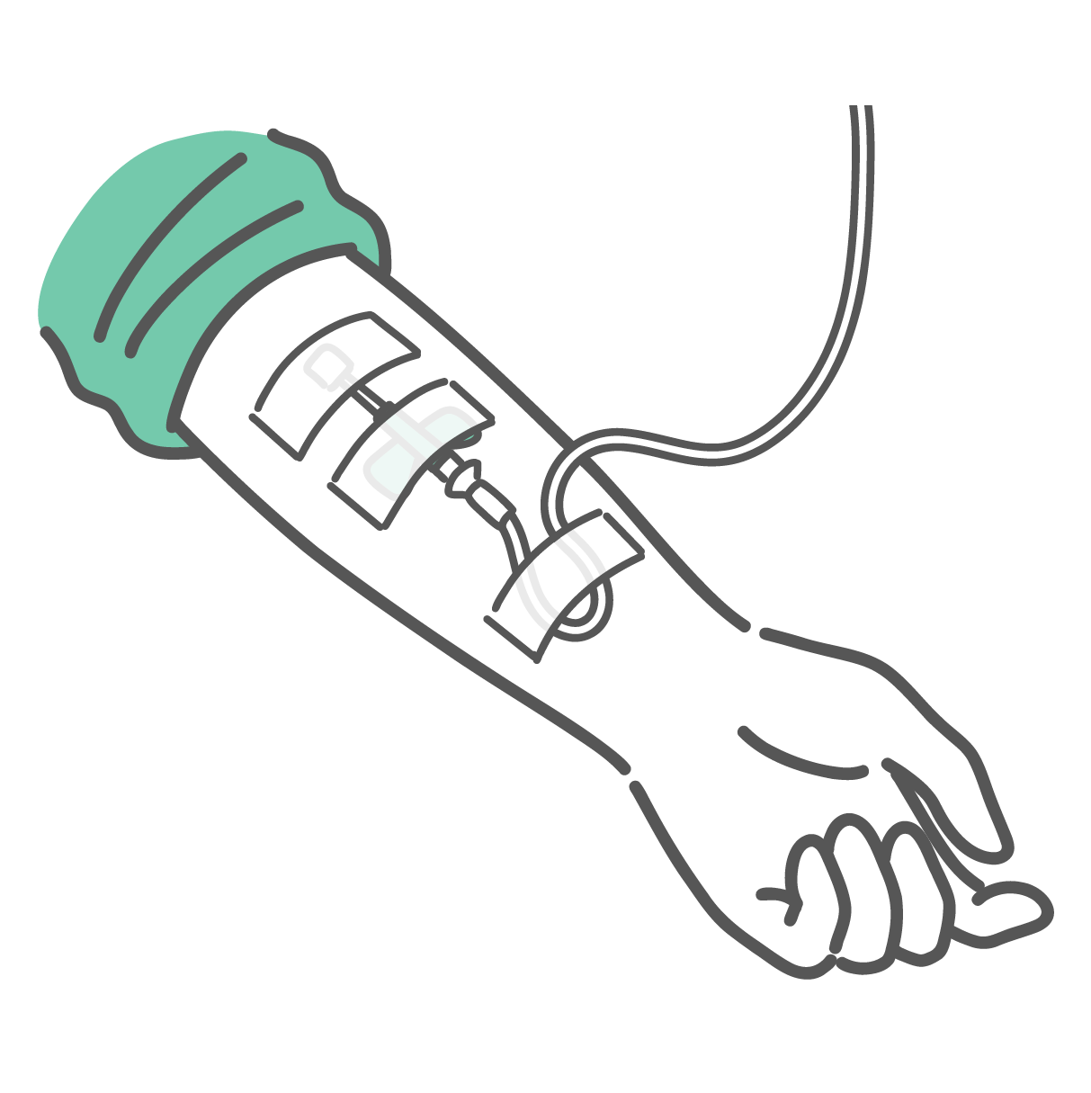 点滴(輸液)中の腕のイラスト(留置針とテープ固定)