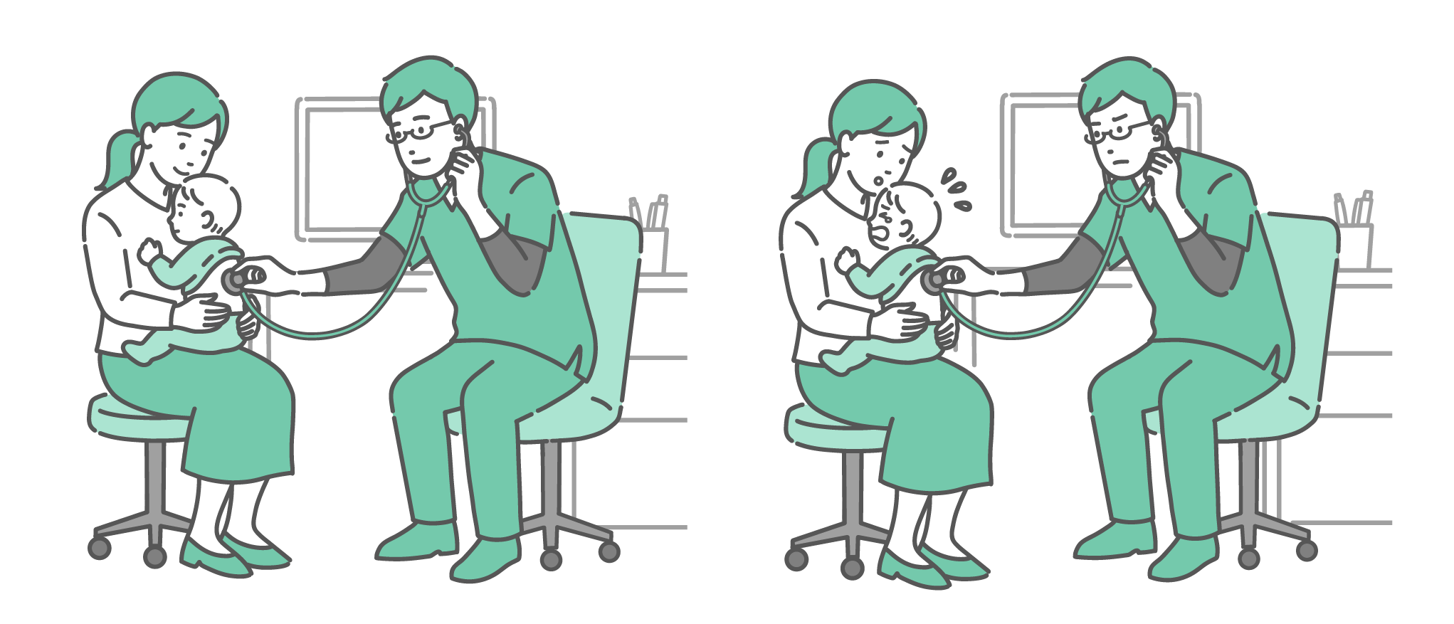季節・アレルギー症状 スクラブを着用した男性医師による赤ちゃんの背中の聴診イラストセット(笑顔・泣き顔)