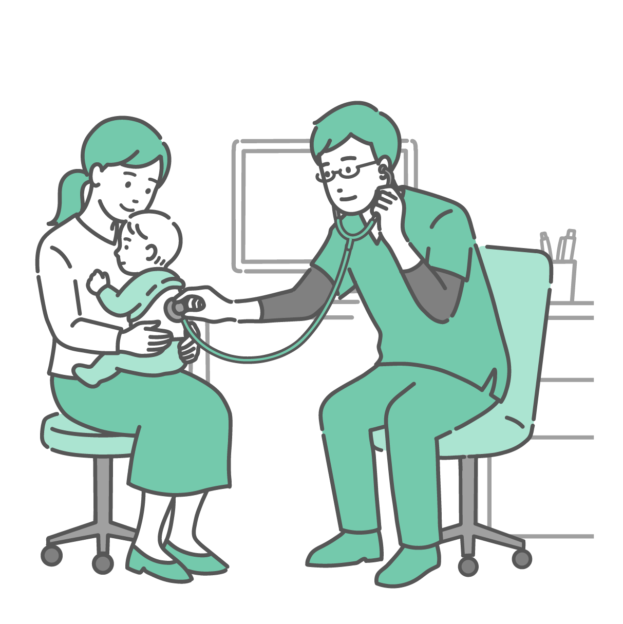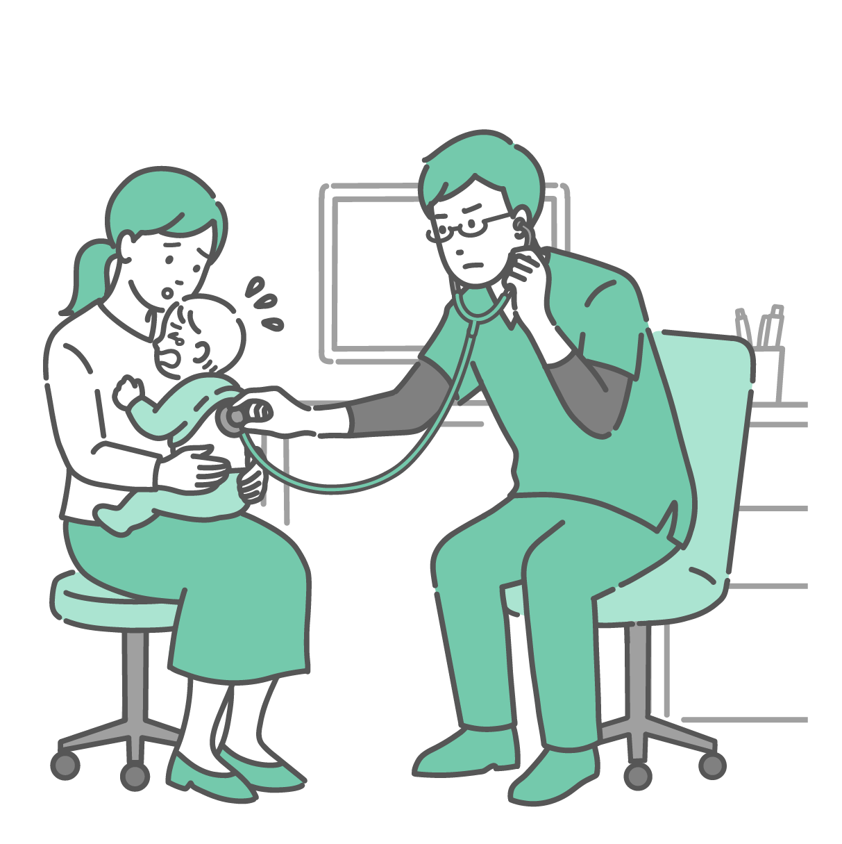 季節・アレルギー症状 スクラブを着用した男性医師による母親に抱かれた赤ちゃんの背中の聴診イラスト
