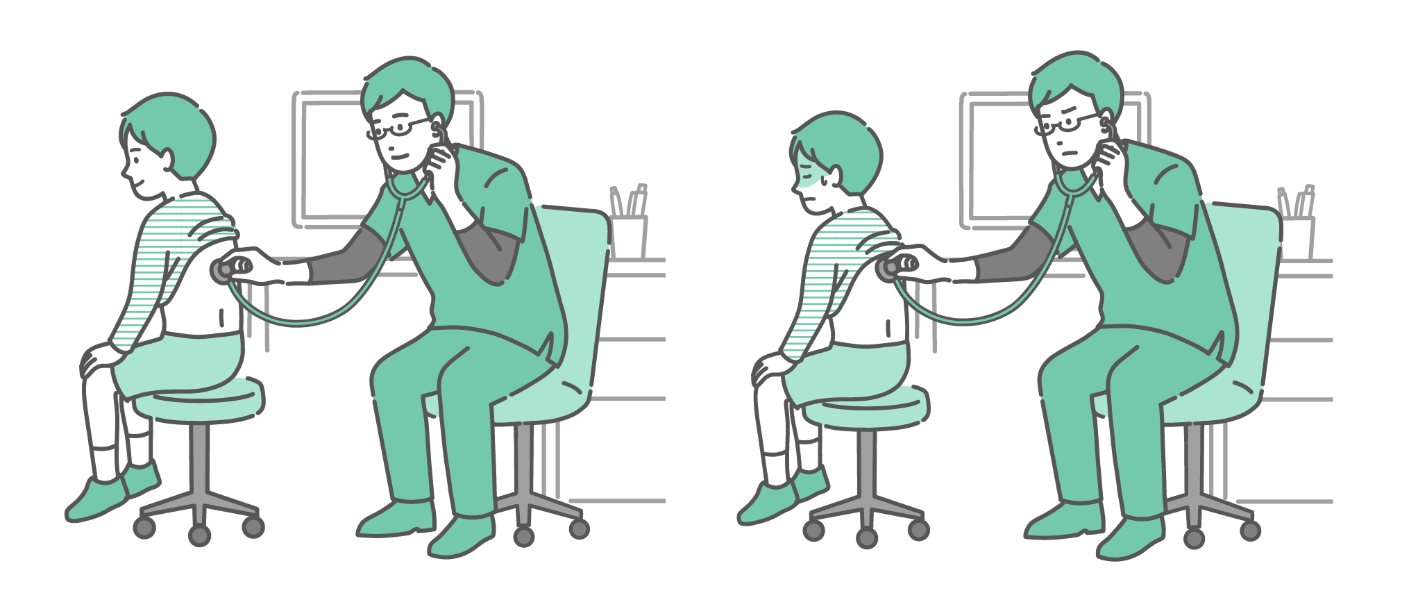 季節・アレルギー症状 スクラブを着用した男性医師による女の子の背中の聴診イラストセット(正常・異常/体調不良)