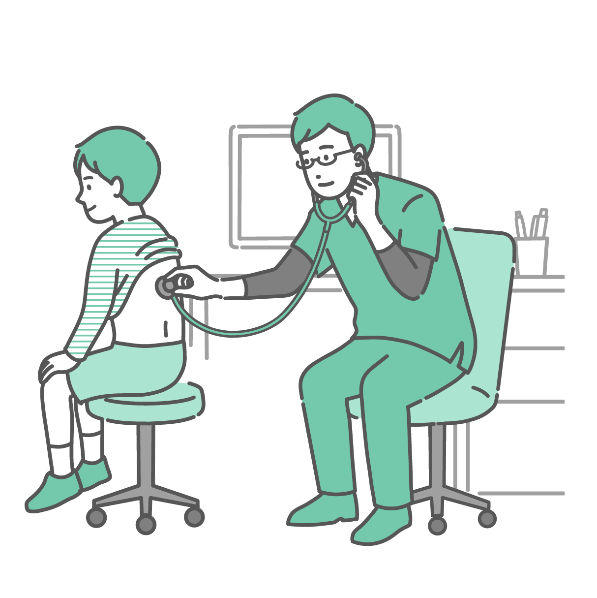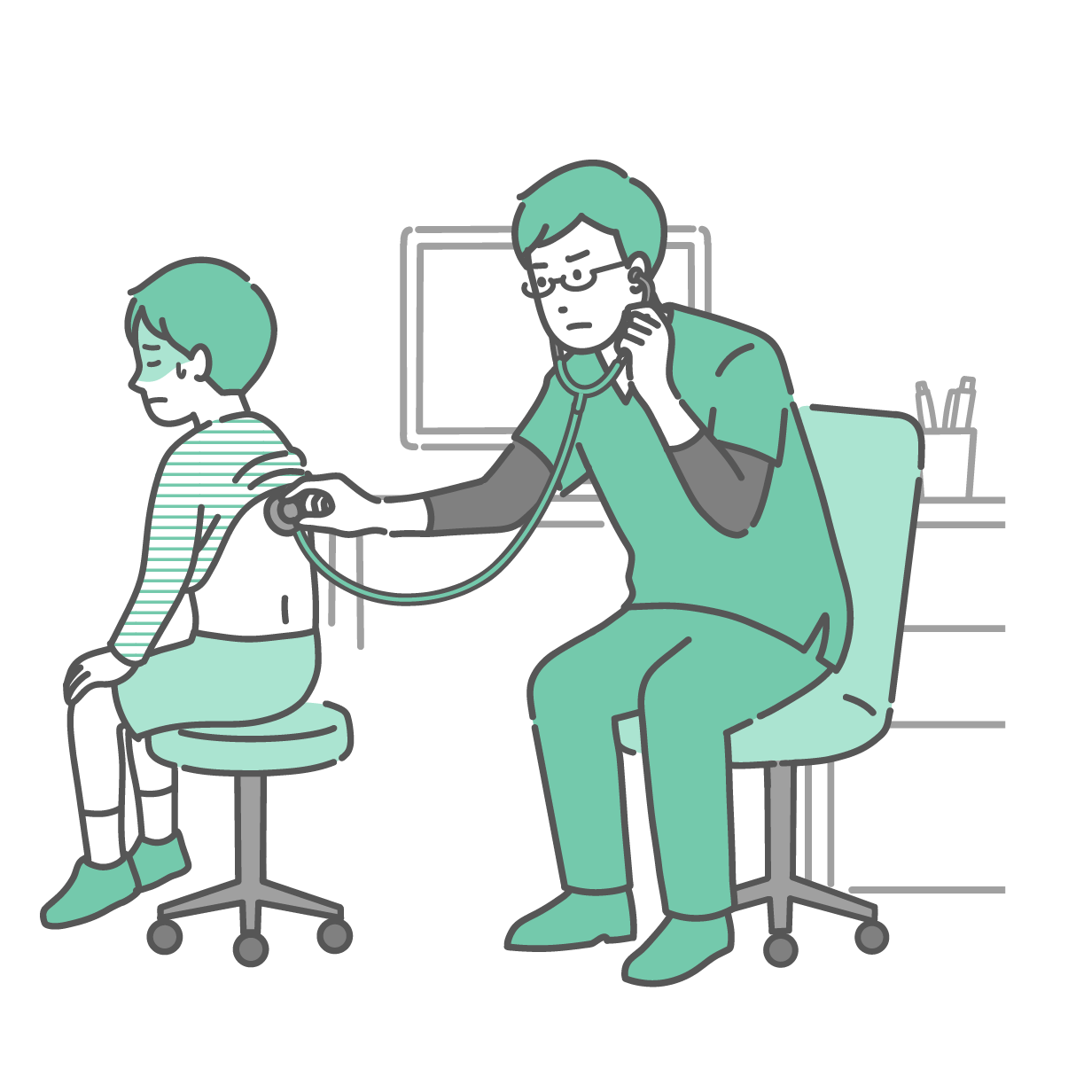 季節・アレルギー症状 背中の聴診を受ける冷や汗をかいた男の子と深刻な表情のスクラブの男性医師のイラスト