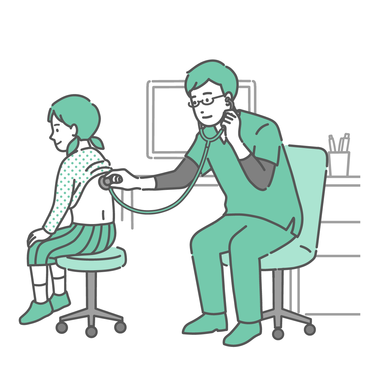 季節・アレルギー症状 スクラブを着用した男性医師による女の子の背中の聴診イラスト