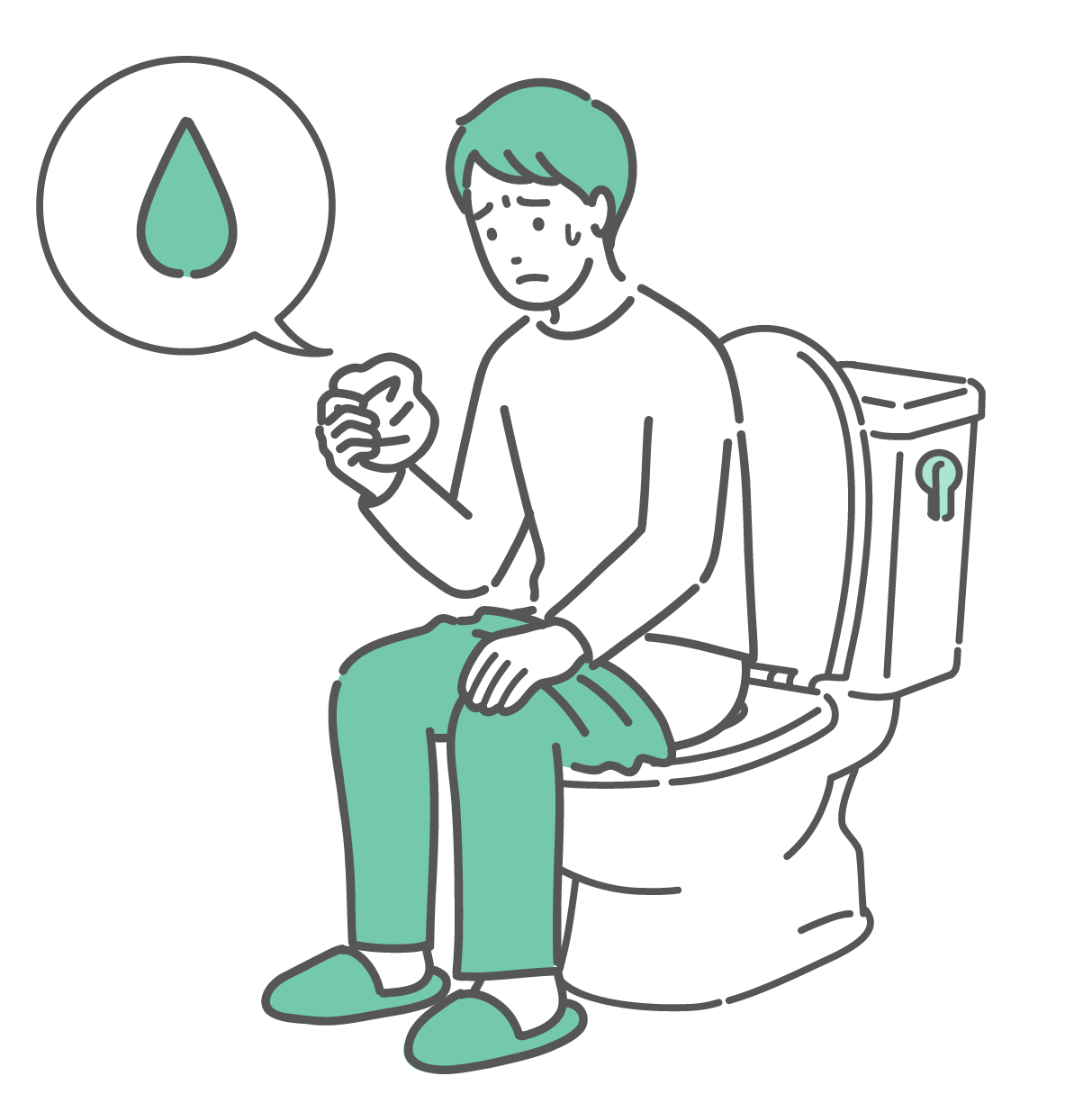 検査・測定 トイレで紙を見て出血や分泌物を確認する男性のイラスト(血便・尿漏れ・雫アイコン)
