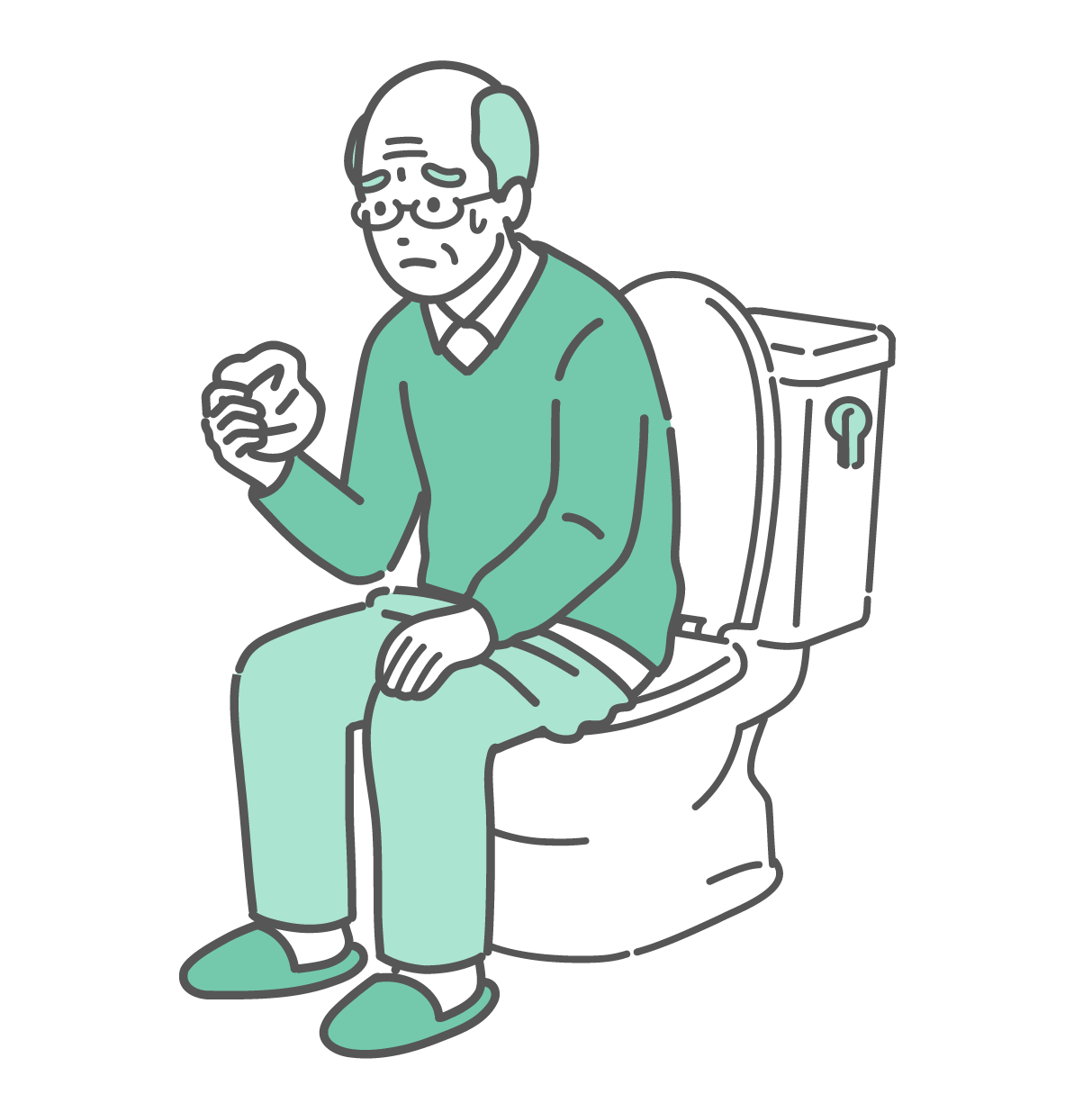 介護・福祉 トイレで紙を見て血便や異常を確認する高齢男性のイラスト(セルフチェック・不安)