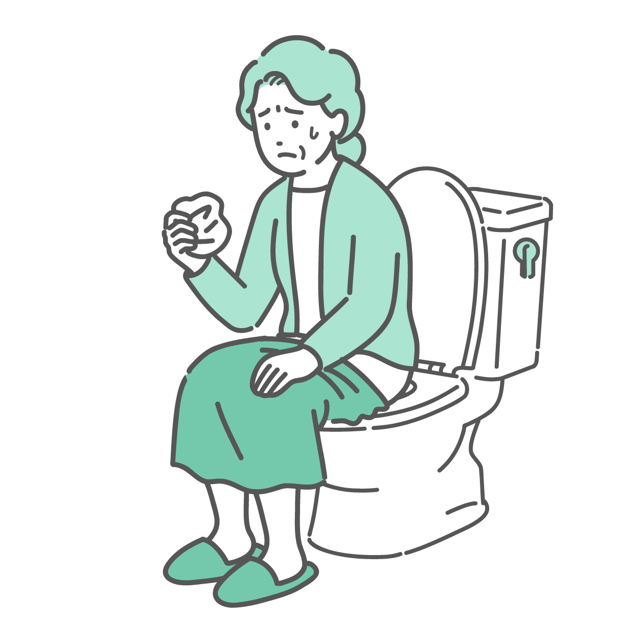 介護・福祉 トイレで紙を見て尿漏れや出血を確認する高齢女性のイラスト(尿失禁・不正出血・雫アイコン)