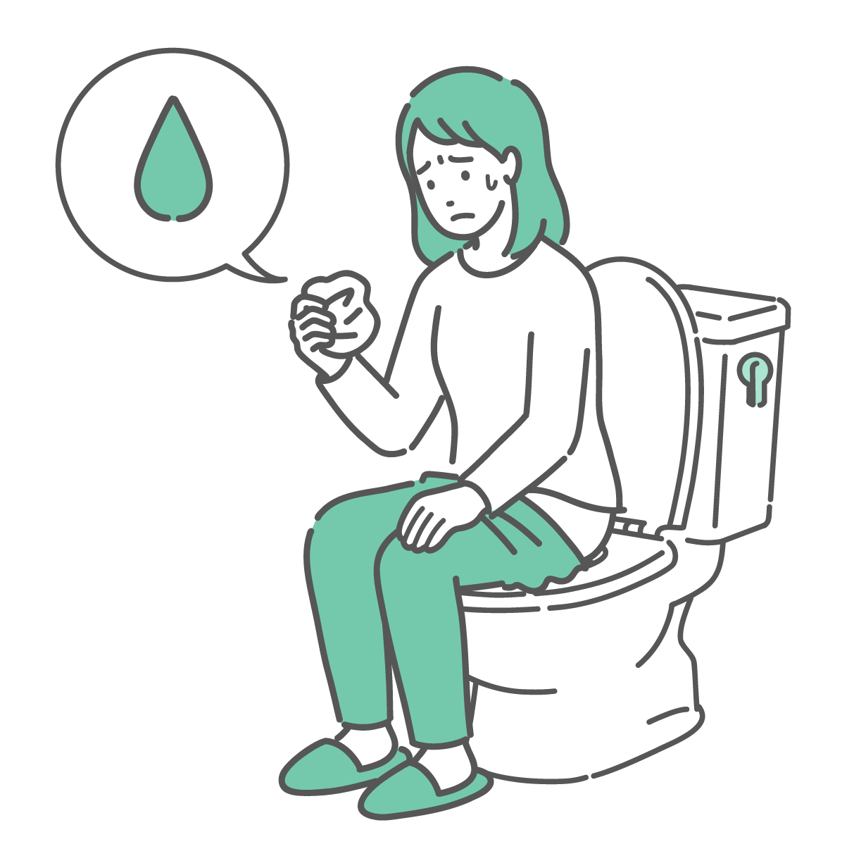 女性の健康・更年期 トイレで紙を見て経血やおりもの、尿漏れを確認する女性のイラスト(不正出血・雫アイコン)