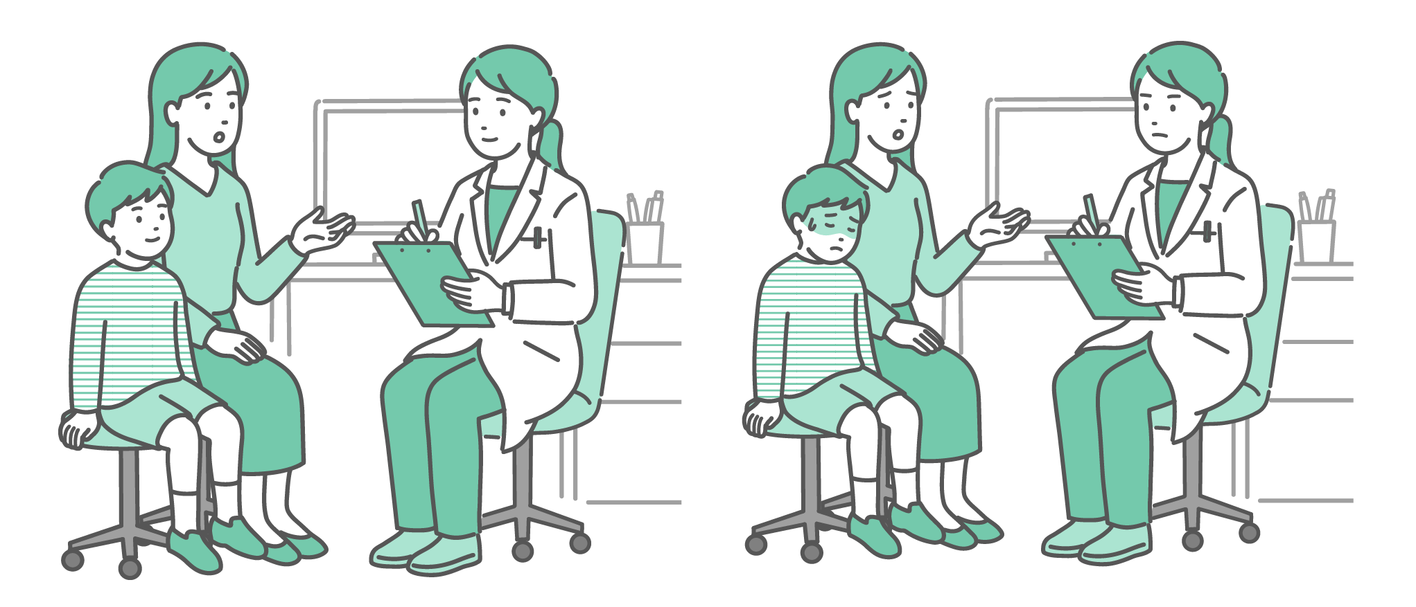 小児科・子供の健康 問診・診察の様子セット(男の子と母親と女性医師)