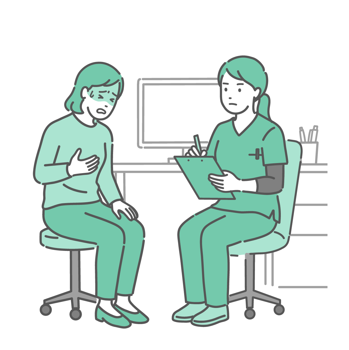 女性の健康・更年期 体調不良を訴える女性患者と女性医師・看護師(スクラブ・救急)
