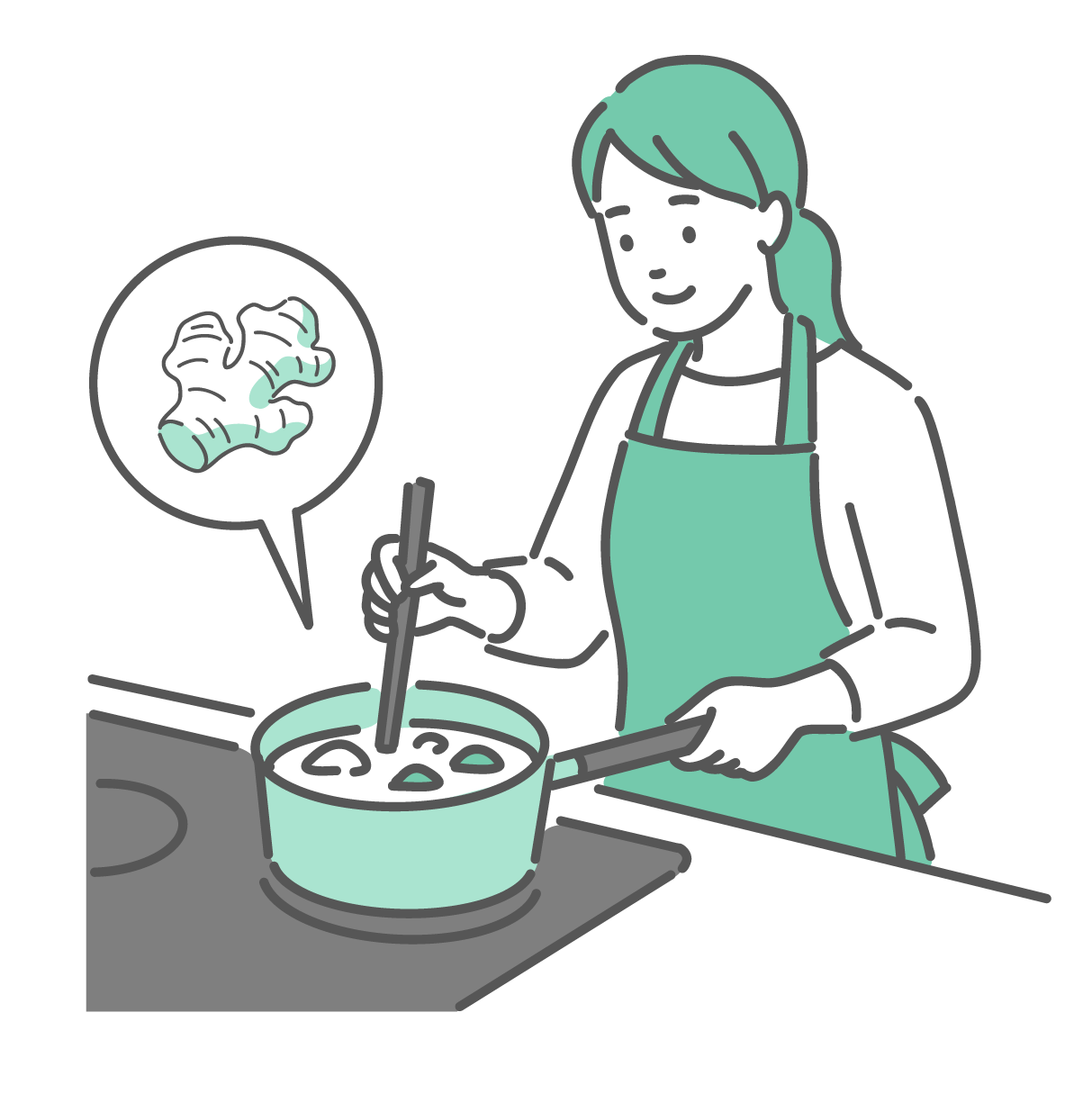 生活習慣 生姜を使った温活料理をする女性のイラスト(冷え性対策・食養生)
