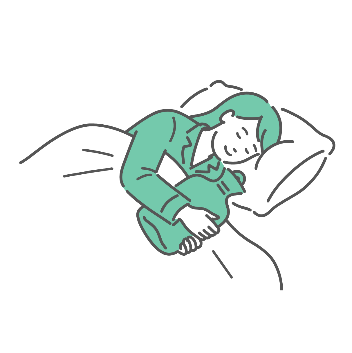 セルフケア・マッサージ 湯たんぽを抱いて寝る女性のイラスト(安眠・温活)