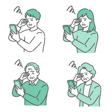 介護・福祉 スマホを見て目をこする高齢女性のイラスト(老眼・白内障・糖尿病網膜症)